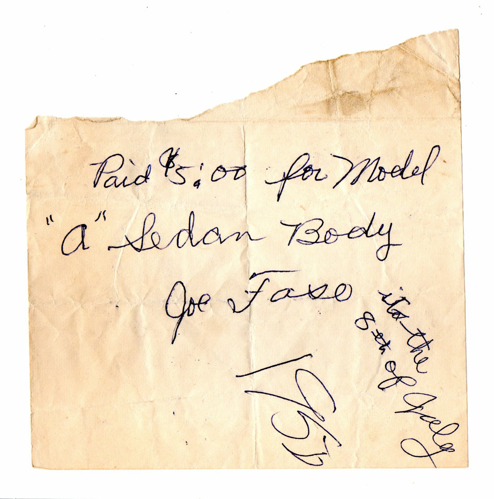 Like my first car, the body style of my second car wasn’t my first choice, it happened by accident. My plan was to use a later Ford roadster pick-up body on the frame and running gear that I kept from my first car. The later 1926 and 27 Ford bodies were slightly larger in the driver’s compartment than a 1923 body, making it a lot more comfortable for two people. After 4 or 5 months of looking for a later roadster pick-up body, I happened to stop by a friend’s house, Joe Faso who lived with his grandparents on their Alice Ave. farm. While there I noticed a 1930 Model A sedan body sitting on a couple of saw horses that Joe had picked up during his travels, and was now interested in selling. After looking the body over, I found it to be in very good condition, and decided to buy it. Joe cut me a super deal, selling it for $5.00. Although I really wanted a 1927 Ford roadster pickup, the Model A sedan was a good second choice.