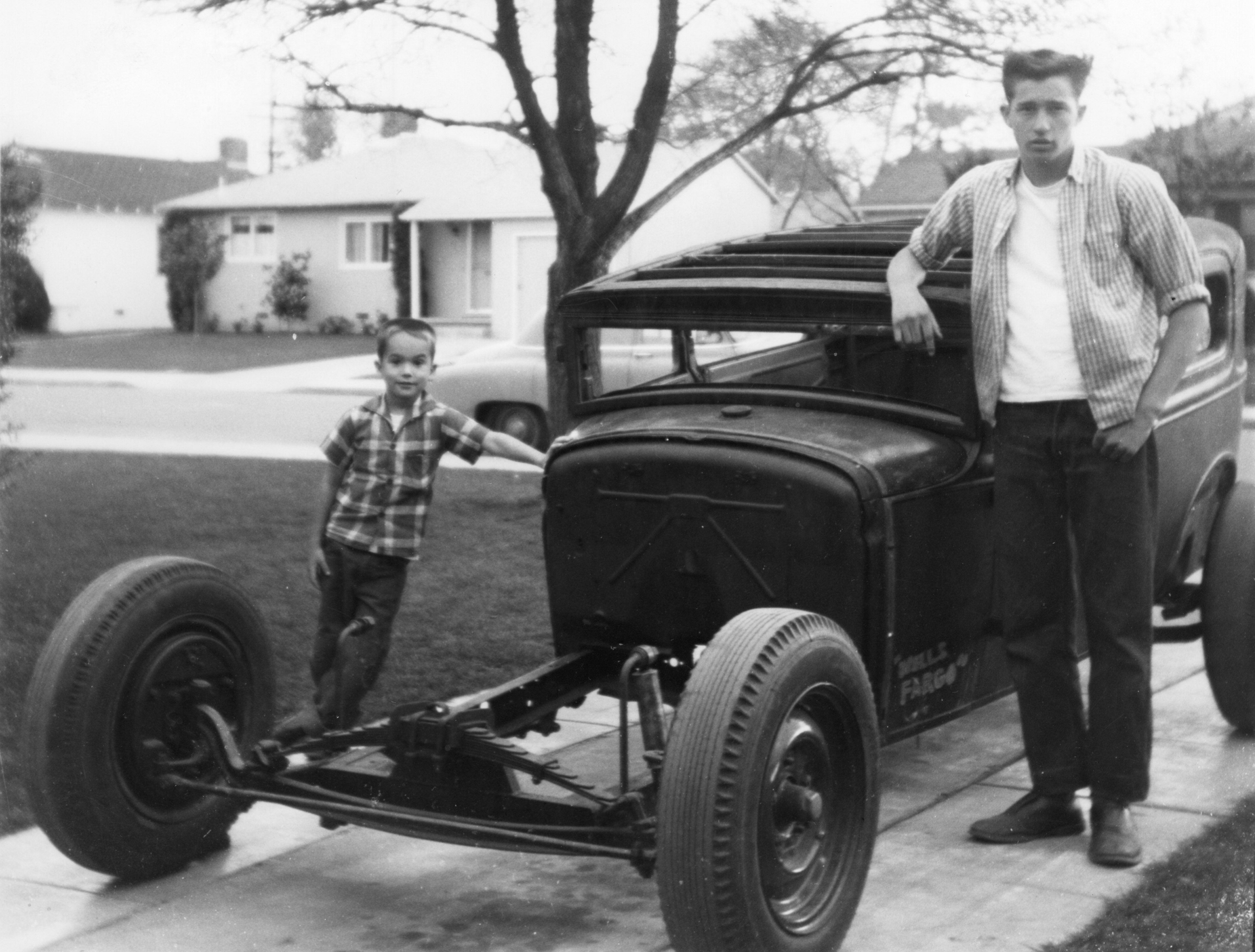 One of the trends was the car’s ‘rake’. Rake in this case was the angle the car set in relation to the ground (front lower than the rear). This was very popular at the time, and a must for a hot rod. There were a couple ways to accomplish this; one was to use small tires on the front, and large tires on the rear. Another was to use a dropped front axle, and I decided to do both. I picked up some large rear tires (8.20 x 15”) from the used tire pile at our local neighborhood Shell service station, and I had Mor-Drop Axles in Oakland, Calif. make me a dropped front axle. Together they created a slight rake, but it wasn’t enough. I wanted the rake to be a little more radical. So, I used a third method to lower the front end of the car, a suicide front crossmember, which drops the frame down behind the front axle. The crossmember was a part that had to be custom made using steel plate, tubing, and a lot of welding, something I didn’t have any experience with. I was in my second year of high school metal shop, but so far I had only worked with light gauge sheet metal and copper.