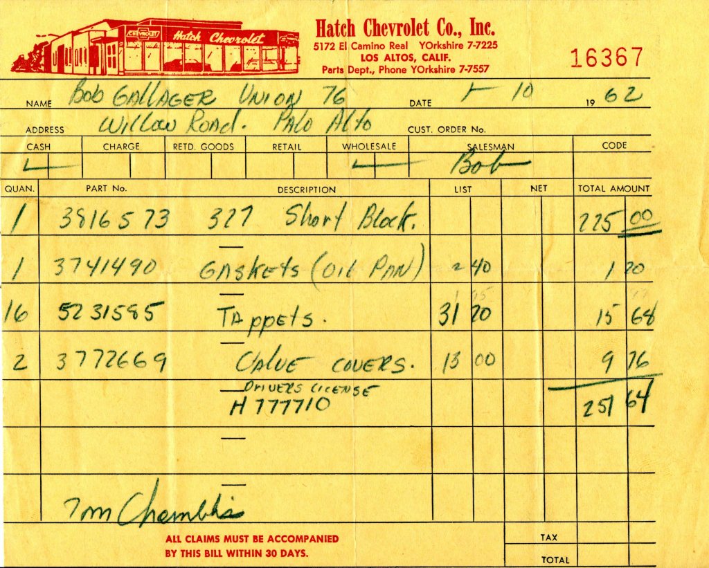 I was now out of high school living at home, and working full time at Formway Machine Shop in Los Altos. I also occasionally worked on weekends and some evenings at a friend’s (Bob Gallagher) father’s Union 76 gas station on Willow Road in Palo Alto (just behind the Stanford Shopping Center). So, for the first time, I now had money to buy most anything I wanted.