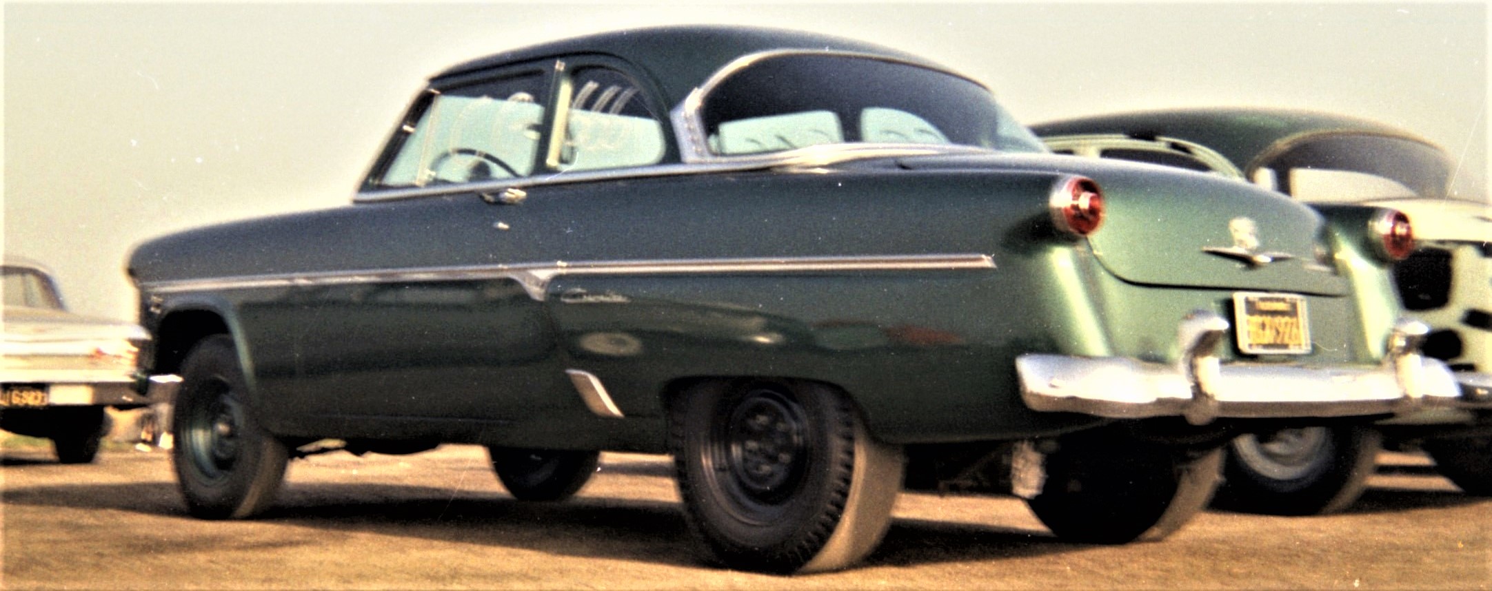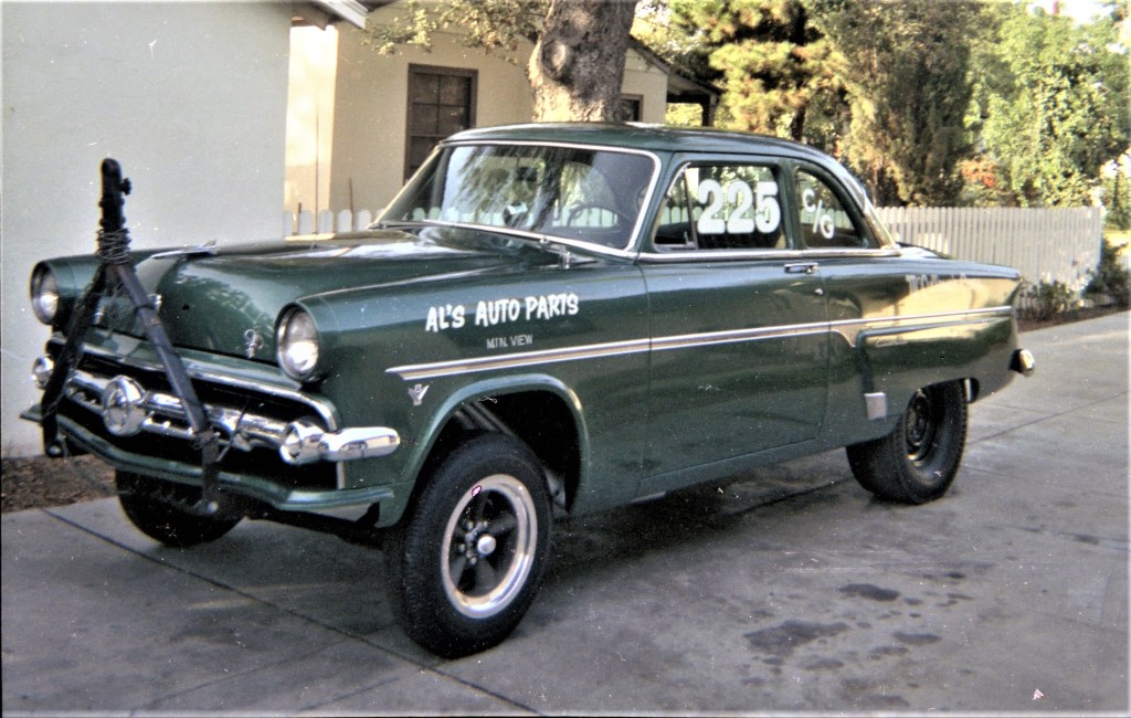 During a run at Fremont Drag Strip in January of 1964, I exploded a clutch, sending clutch parts through the cowling just in front of the windshield. I had the car repaired by a friend, Bill Moranville, at his father’s body shop in Mountain View. Bill decided to paint the car a different color, one that would match the original green color of the ’54’s dash and window frames. The color he picked was a 1958 Cadillac Forest Green, which was almost a perfect match of the stock Ford green dash.