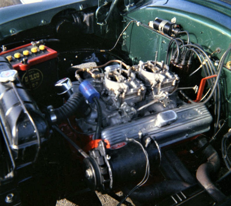 In order to move the ’54, I built a tow-bar using 1948 Ford rear wishbones. At the time most drag race cars were flat towed to the race track rather than using an expensive trailer. I hadn’t planned on racing the car, but it was kind of cool to have tow-bar brackets mounted on the front of your car; permanent tow-bar brackets gave the impression the car was somehow connected to racing. A week or so after buying the car, I purchased a used 1958 220hp 283 cubic inch Chevrolet engine and PowerGlide automatic trans from a local auto wrecker with plans on rebuilding the engine before I installed it in the Ford.